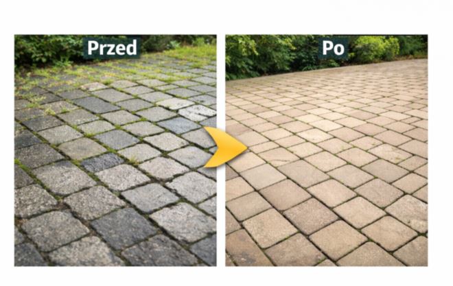 Już po jednym czyszczeniu kostka odzyskuje świeży wygląd i pierwotny kolor. Różnica między stanem przed i po myciu jest bardzo widoczna – nawierzchnia wygląda jak nowa.