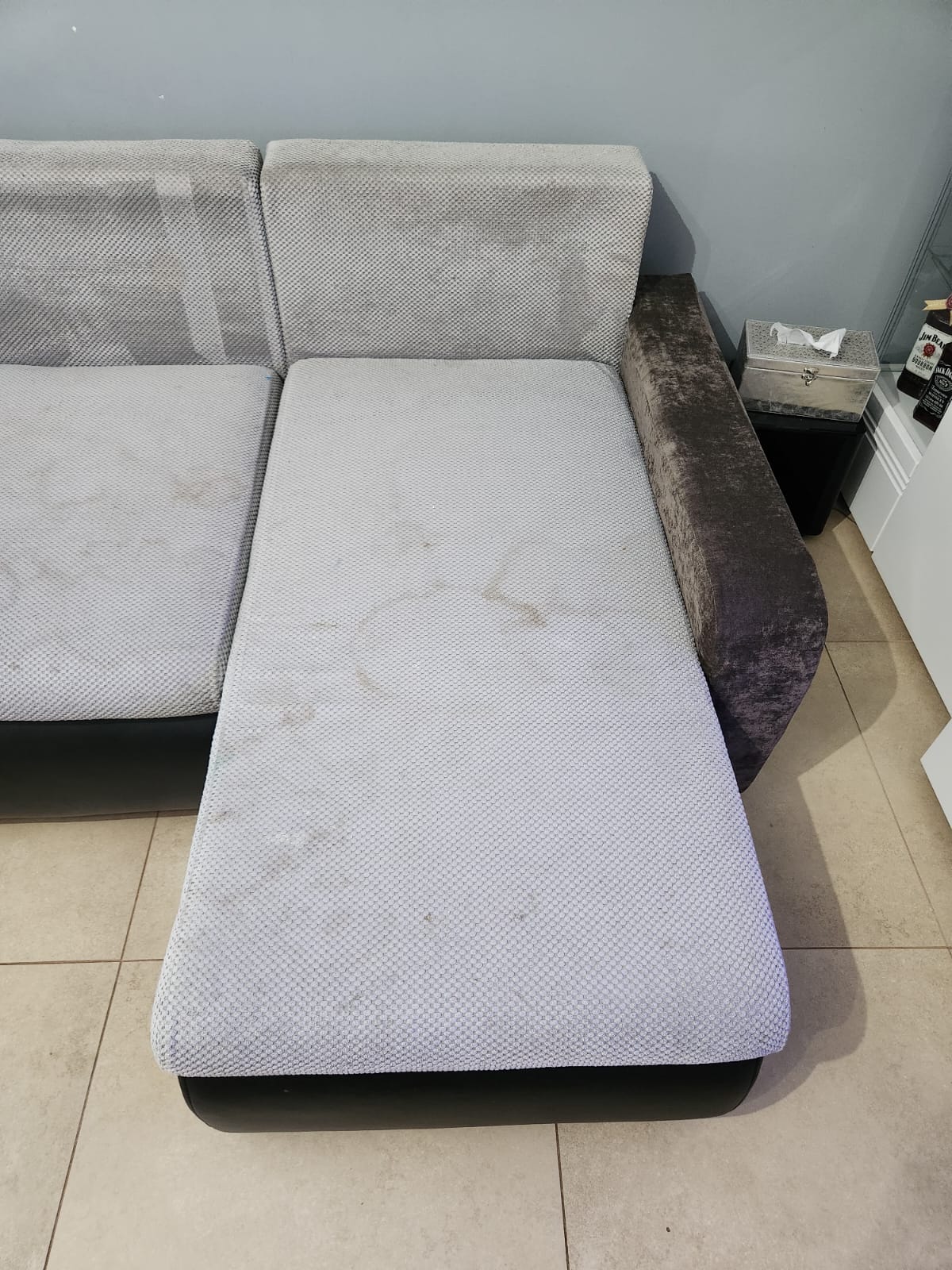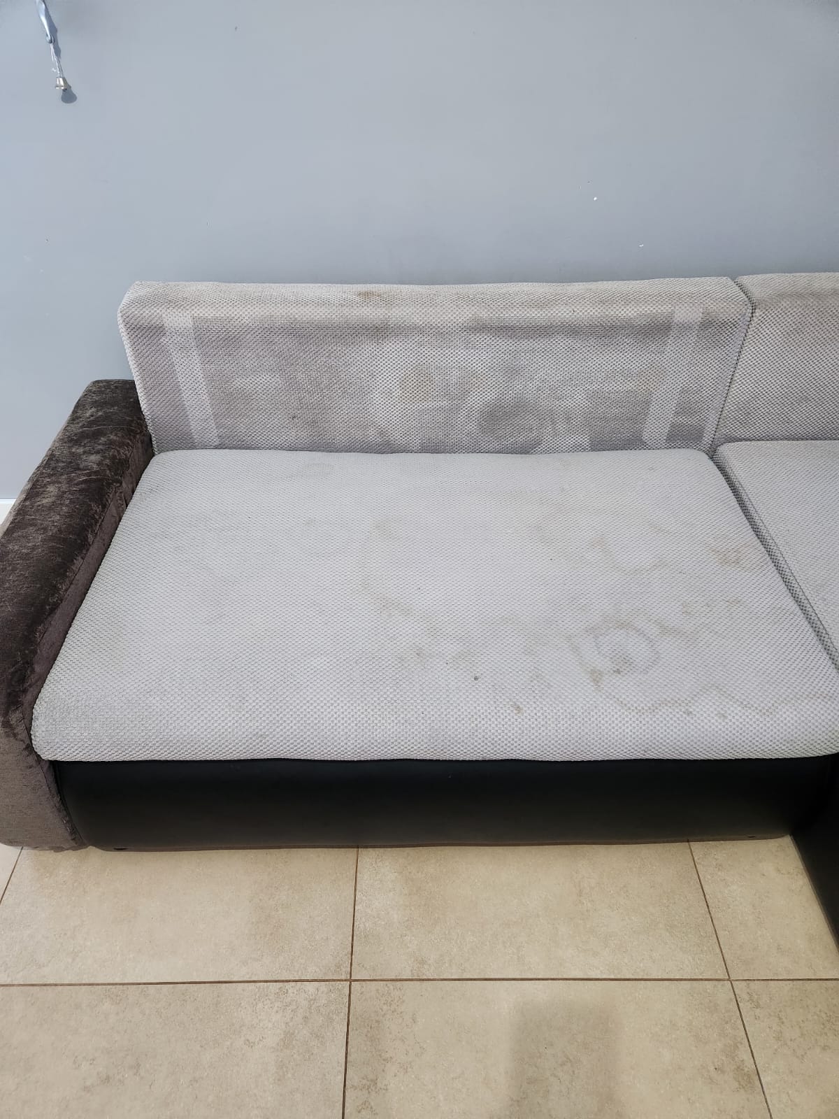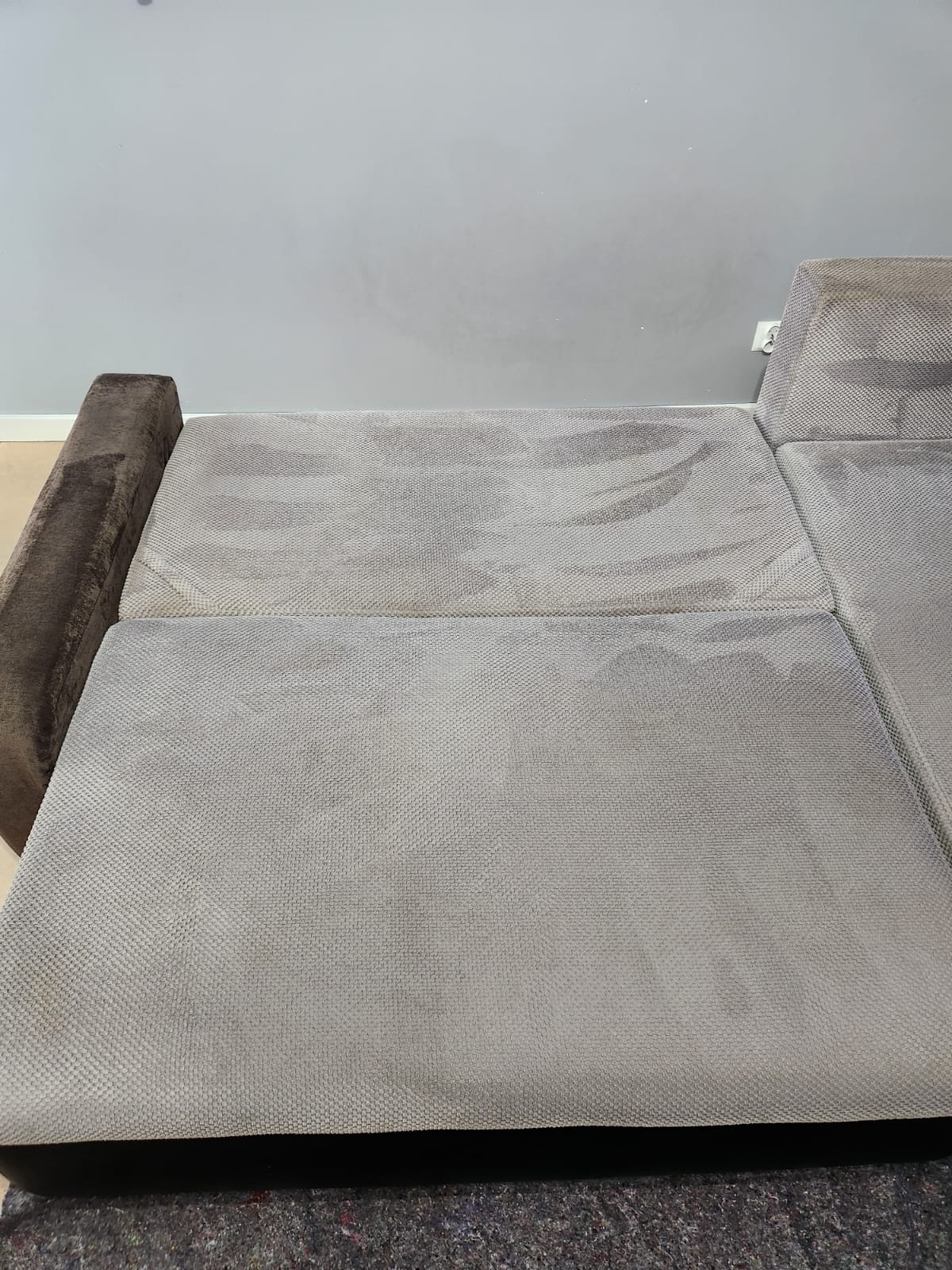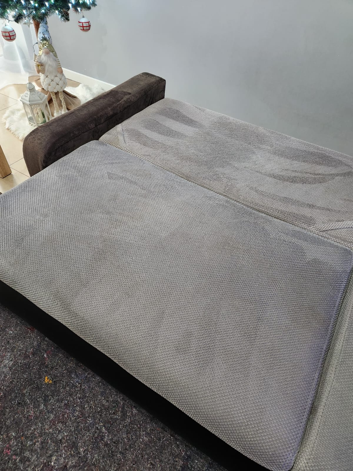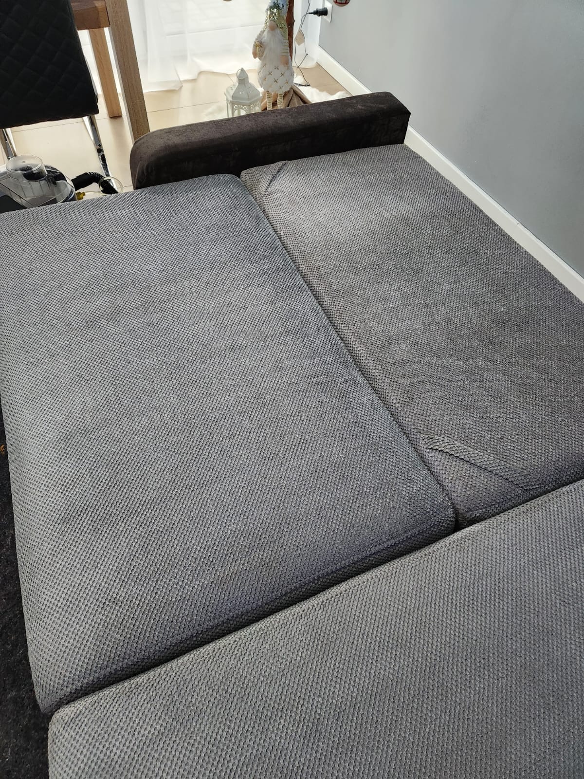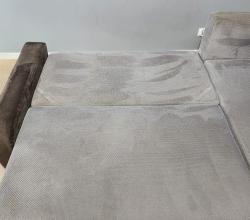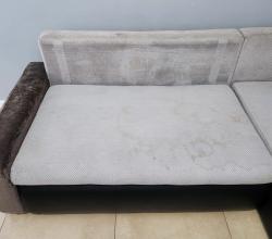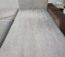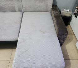 Kolejna realizacja to narożnik z funkcją spania, widoczne zabrudzenia mocno osadzone w strukturze poszycia, dodatkowo przeprowadzona renowacja obszyć z eco skóry.