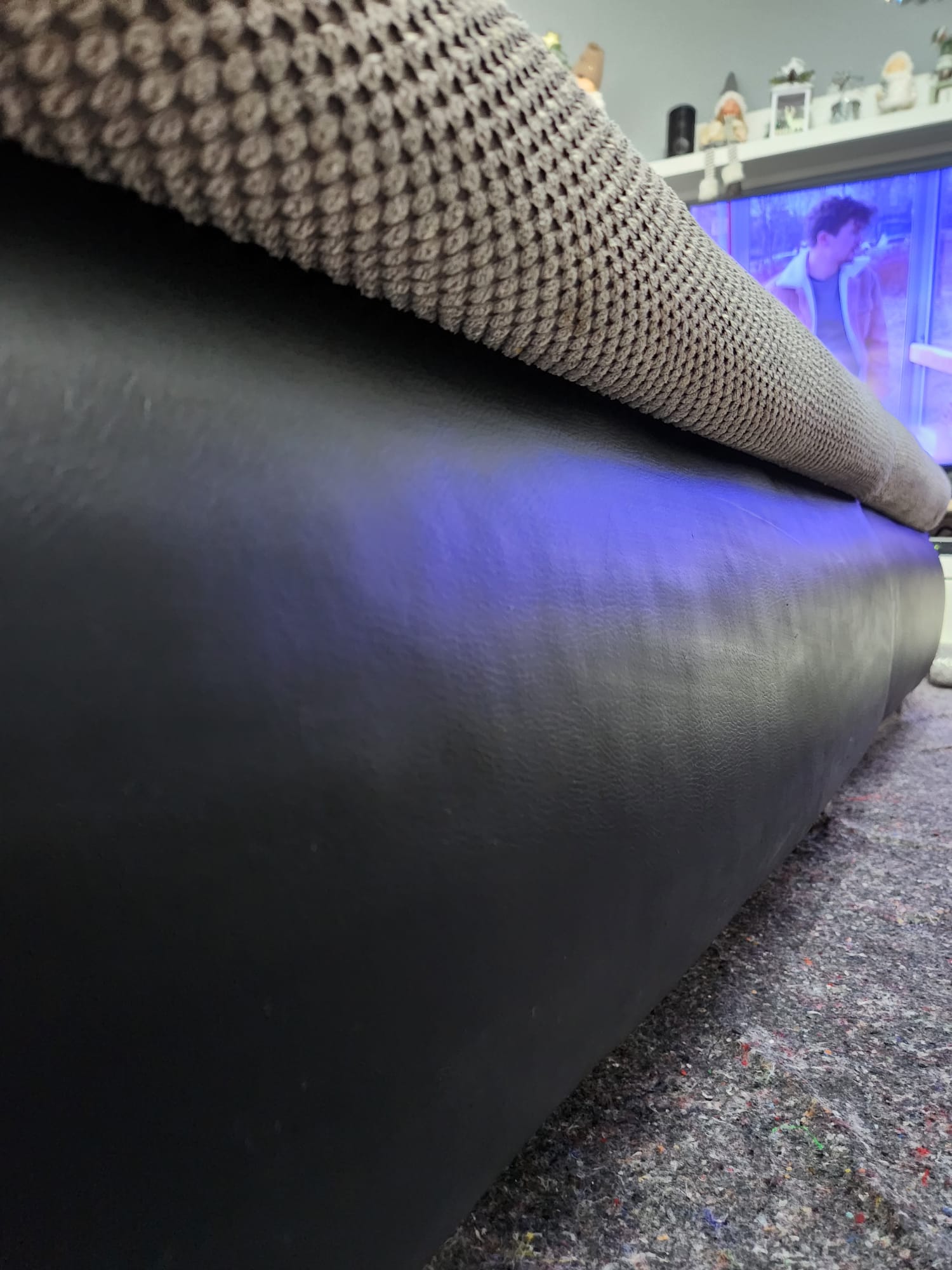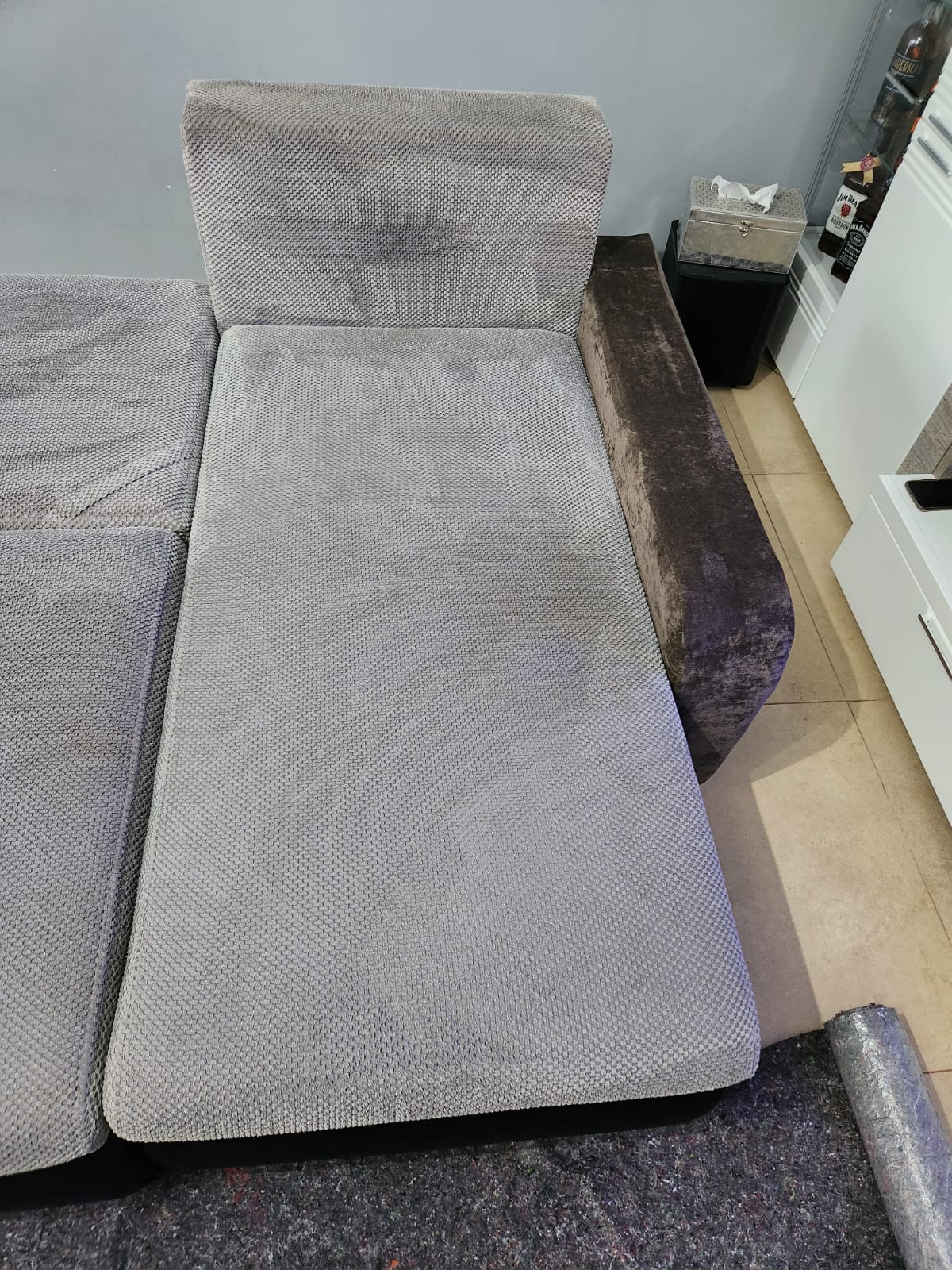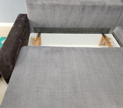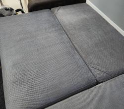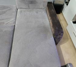 Kolejna realizacja to narożnik z funkcją spania, widoczne zabrudzenia mocno osadzone w strukturze poszycia, dodatkowo przeprowadzona renowacja obszyć z eco skóry.